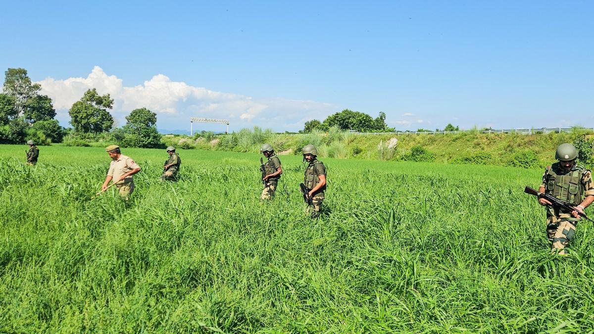 बीएसएफ और जम्मू-कश्मीर पुलिस के जवान 21 अगस्त, 2025 को जम्मू के कनाचक इलाके में देखे गए पाकिस्तानी ड्रोन की तलाश कर रहे हैं। फोटो क्रेडिट: एएनआई