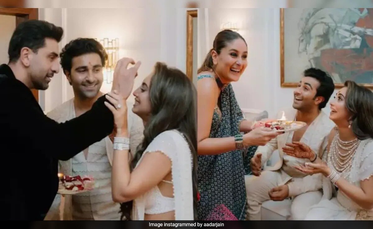 नया दिन, आदर जैन और अलेखा आडवाणी की रोका सेरेमनी की नई तस्वीरें। जोड़ा मिल गया रोकाफ़ाइड पिछले सप्ताह. छवियों का नया सेट प्रशंसकों को कपूर परिवार द्वारा जोड़े के मिलन के जश्न की एक झलक देता है। एक तस्वीर में रणबीर कपूर अप्लाई करते नजर आ रहे हैं टीका अलेखा को जब वह खुशी से झूम उठी। एक अन्य तस्वीर में करीना कपूर अभिनय करती नजर आ रही हैं आरती. तस्वीर के बाकी हिस्से में करिश्मा आदर के माथे पर टीका लगाती दिख रही हैं। मज़ा यहीं नहीं रुका – सैफ अली खान को उत्सव का आनंद लेते हुए देखा गया क्योंकि उन्होंने आदर, अलेखा, करिश्मा, अनीसा और नव्या नवेली नंदा के साथ सेल्फी लेते समय अपनी जीभ बाहर निकाली।