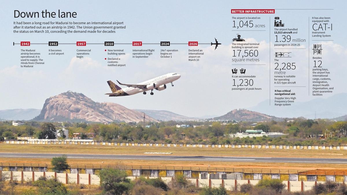 हालाँकि, श्री राममोहन नायडू, जिन्होंने शनिवार (14 मार्च, 2026) को शहर में मदुरै अंतर्राष्ट्रीय हवाई अड्डे के नाम बोर्ड का अनावरण किया, ने कहा कि केंद्र मदुरै में अंतरराष्ट्रीय कनेक्टिविटी लाने में मदद करेगा, क्योंकि इसने हवाई अड्डे को 24×7 चालू कर दिया है और इसे अंतरराष्ट्रीय हवाई अड्डे का दर्जा दिया है।