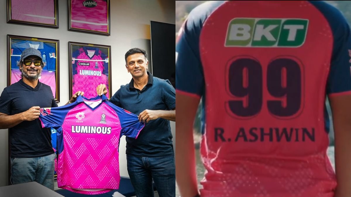 छवि स्रोत: राजस्थान रॉयल्स/एक्स कुमार संगकारा और राहुल द्रविड़ नए आरआर जर्सी (बाएं) के साथ। रवि अश्विन को आरआर (दाएं) से सम्मानित किया जाता है।