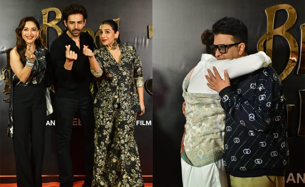 के निर्माता भूल भुलैया 3 कल रात मुंबई में एक सफल जश्न का आयोजन किया। फिल्म के मुख्य कलाकार कार्तिक आर्यन, माधुरी दीक्षित, विद्या बालन स्टाइल में पहुंचे। वे सभी काले कपड़े पहने हुए थे। कार्तिक आर्यन ने ऑल-ब्लैक लुक अपनाया, जबकि माधुरी दीक्षित ने स्टाइलिश पहनावा पहना। वाइब्स को ध्यान में रखते हुए विद्या बालन ने भी प्रिंटेड को-ऑर्ड सूट पहना था। तृप्ति डिमरी ने भी रात के लिए काले रंग को चुना। पार्टी में माधुरी दीक्षित के प्लस वन उनके पति श्रीराम नेने थे। कार्तिक आर्यन अपने माता-पिता के साथ पार्टी में शामिल हुए। माधुरी दीक्षित, विद्या बालन और कार्तिक आर्यन ने पापराज़ी को क्लिक करने के लिए कई बेहतरीन पल दिए। इस शानदार तिकड़ी को रेड कार्पेट पर फिल्म का सिग्नेचर शॉट लेते देखा जा सकता है। उन्हें कोरियन हार्ट पोज़ करते हुए भी देखा जा सकता है, जिसके लिए रश्मिका मंदाना मशहूर हैं। यहां देखें तस्वीरें: