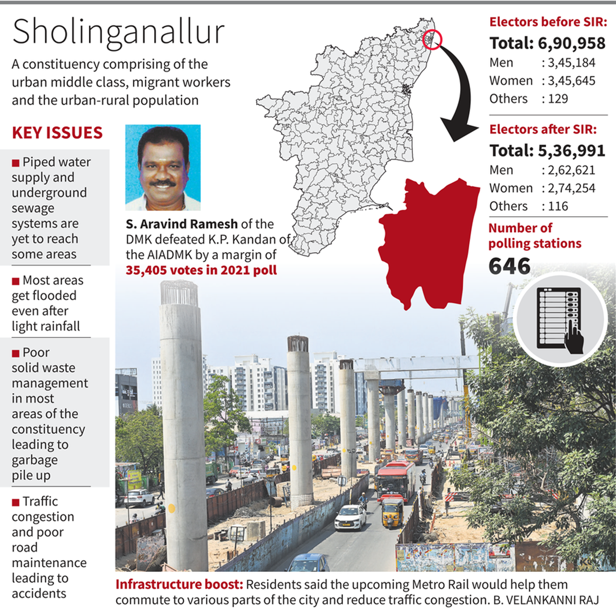 शोलिंगनल्लूर निर्वाचन क्षेत्र का गठन 2011 में हुआ था। मतदाताओं की संख्या के मामले में यह सबसे बड़ा निर्वाचन क्षेत्र है, यह आईटी गलियारे, पल्लीकरनई दलदली भूमि के लिए प्रसिद्ध है और पेरुंगुडी डंपयार्ड के लिए कुख्यात है। जैसे-जैसे चुनावी सरगर्मी तेज़ होती जा रही है, निर्वाचन क्षेत्र के निवासियों ने महसूस किया कि बहुत कुछ नहीं बदला है। जबकि पेरुंबक्कम जैसे कुछ क्षेत्रों में तूफानी जल नालियां और पीने के पानी के पाइप नेटवर्क प्राप्त हुए हैं, कई क्षेत्र अभी भी इन सुविधाओं का इंतजार कर रहे हैं।
